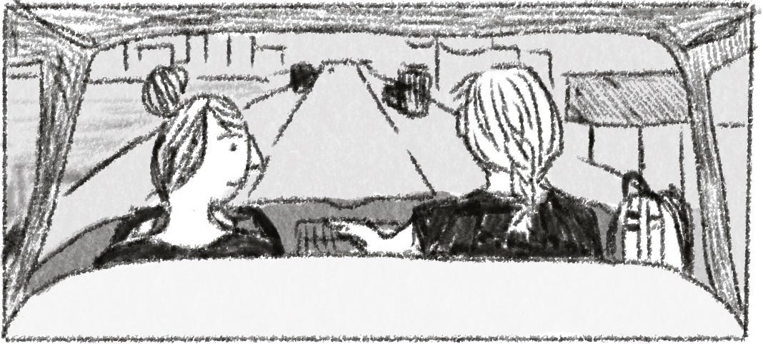 I tried something a little different. This is a conversation I had with my friend K on a drive to Oregon this summer. We really did have this conversation, almost word for word, but when I transcribed it, I moved some pieces around and added explanation here and there to make it make sense and tell a more complete story. I don’t know what genre of writing it is anymore. Also, drawings.